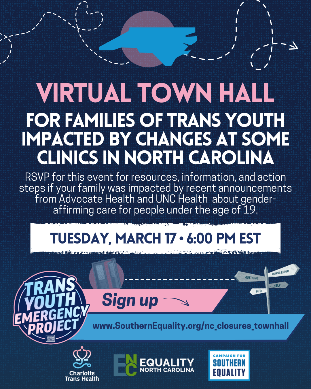 This event will be hosted by Equality NC, Charlotte Trans Health, and the Campaign for Southern Equality’s Trans Youth Emergency Project.